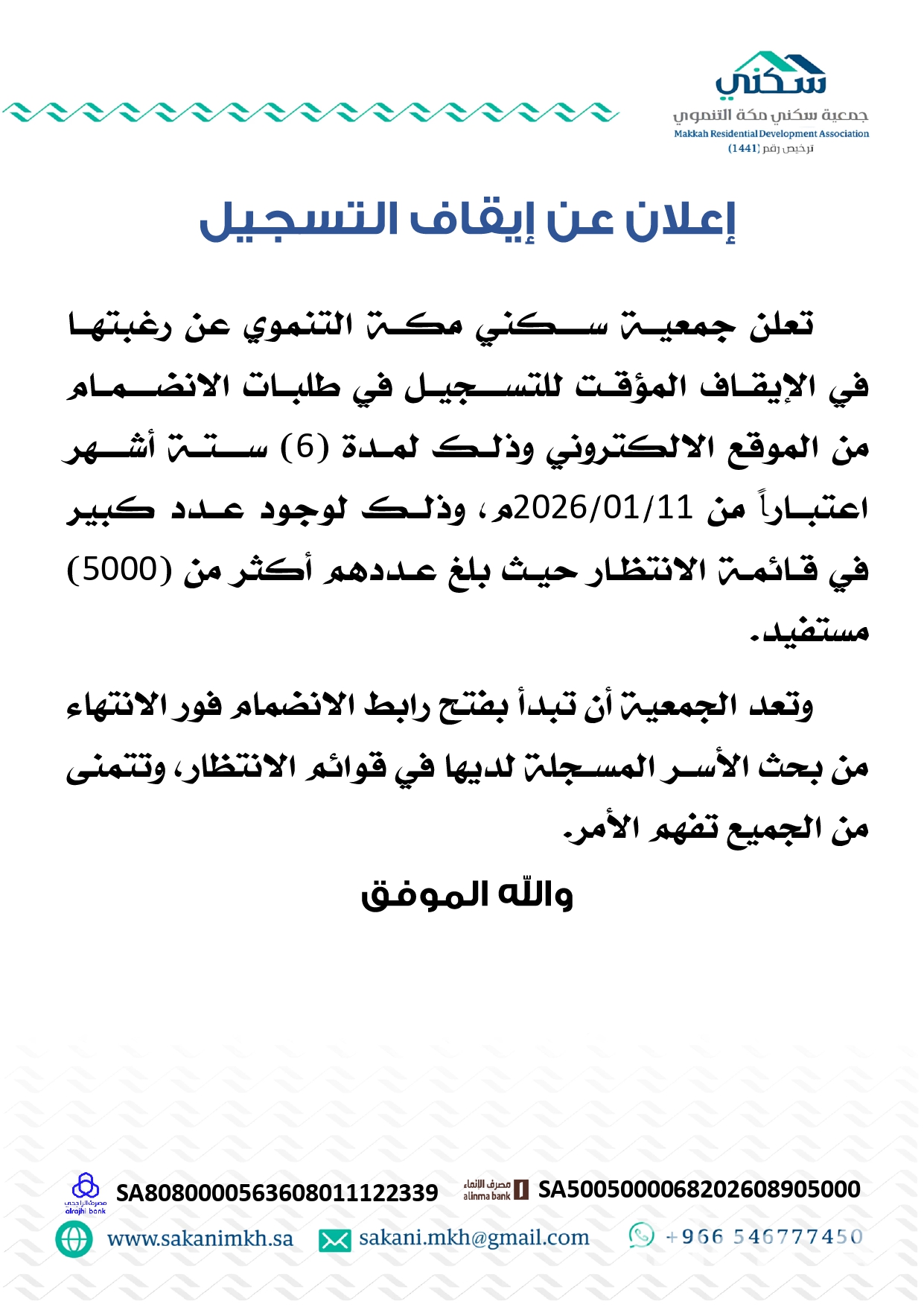 تنوية عزيز المتقدم أو المتقدمة تسجيلك في موقع الجمعية لا يعتبر القبول النهائي وفي حال تم قبولك يتم التواصل معك من قبل الباحث الاجتماعي التابع للجمعية